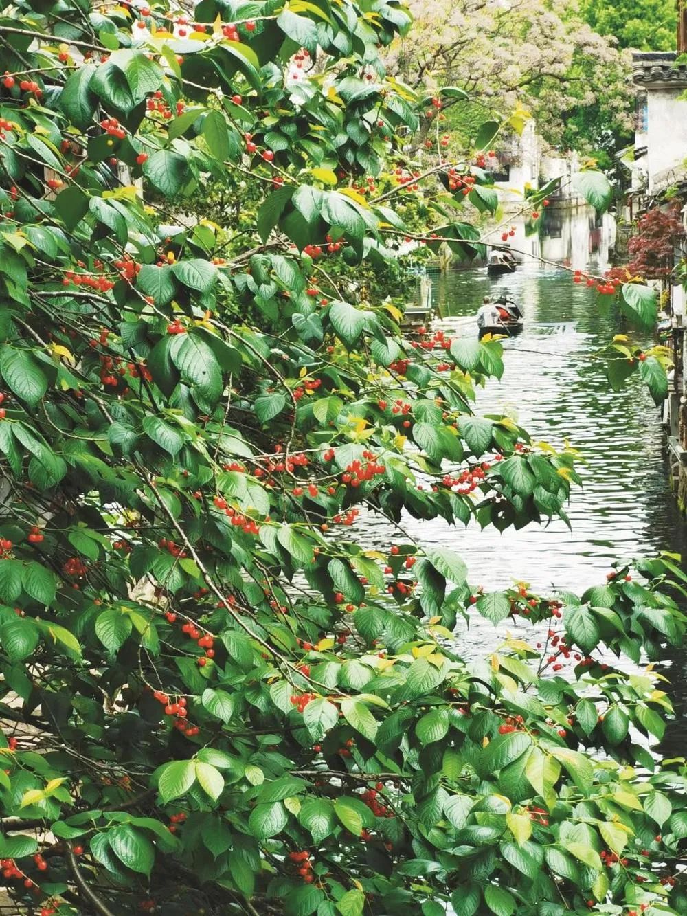 四月樱桃季,绍兴府桥畔的樱桃树上,挂满了红彤彤的小樱桃,乌篷悠悠划过,这个美好画面定格了“府桥最美四月天”。