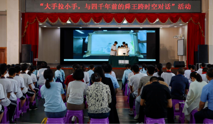 结合以上典籍,大学生们创设4个教学场景,带领中小学生“穿越时空”,通过经典诵读、情景演绎、诗歌传唱等方式跨时空对话四位作者的教学形式,大中小学生共同研学,“大手拉小手”一起感悟历代对虞舜精神的歌颂与传承。