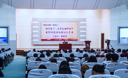 4月23日晚,“时政大课堂”系列之三,市委宣传部副部长黄爱芬主讲提升国际传播力和舆论引导力,为现场400余名学生作题为“新形势下,大学生如何提升国际传播力和舆论引导力”的专题讲座。