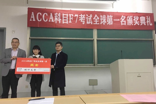 2015年,经济与管理学院实施国际化创新型人才培养方案,为学生提供专业的学科知识技能和前沿的学科信息动态,与高顿财经合作开设了“ACCA方向班”。“ACCA方向班”独立组班、单独授课,上海高顿财经和学院选拔专家型教学团队进行国际化授课,配备助教辅导和职业发展支持,学生专业技能和国际视野得到提升。开班以来,F阶段课程通过率远超全球平均水平。特别是15级赖媚君同学在学习上抓住重点、自我突破、及时温故,在2017年9月ACCA考季中取得F7(财务报告)90分的高分,斩获世界第一。为祝贺赖媚君同学获得傲人佳绩,经济与管理学院及高顿财经集团共同向赖媚君同学颁发8000元奖学金,以资鼓励。此外,赖媚君同学还将获得由ACCA总部颁发的200英镑奖金。