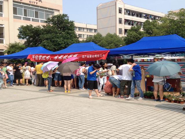 在国庆节到来之际,为了让学校教职工享受更好的服务,学校工会联合资产经营公司分工会开展商品优惠供应服务活动。 河西餐厅广场上,工作人员早早做好了准备工作。装水果,称重量,贴标签,一切准备就绪后,在十一点半左右,广场摊位前就围满了教职工和学生。手工水饺和水果尤其受到大家的欢迎,蜜柚、冬枣和苹果基本售空。花卉那边也有许多师生驻足观看,花草植物品种丰富,价格公道,大受欢迎。 此次活动历时两小时,受到了师生的好评。