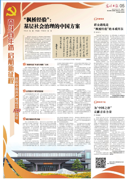 3月17日,《光明日报》在“奋斗百年路 启航新征程 庆祝中国共产党成立100周年”大型主题报道中专版(第5版)报道了“枫桥经验”,我校师生积极发声。相关文章内容如下: