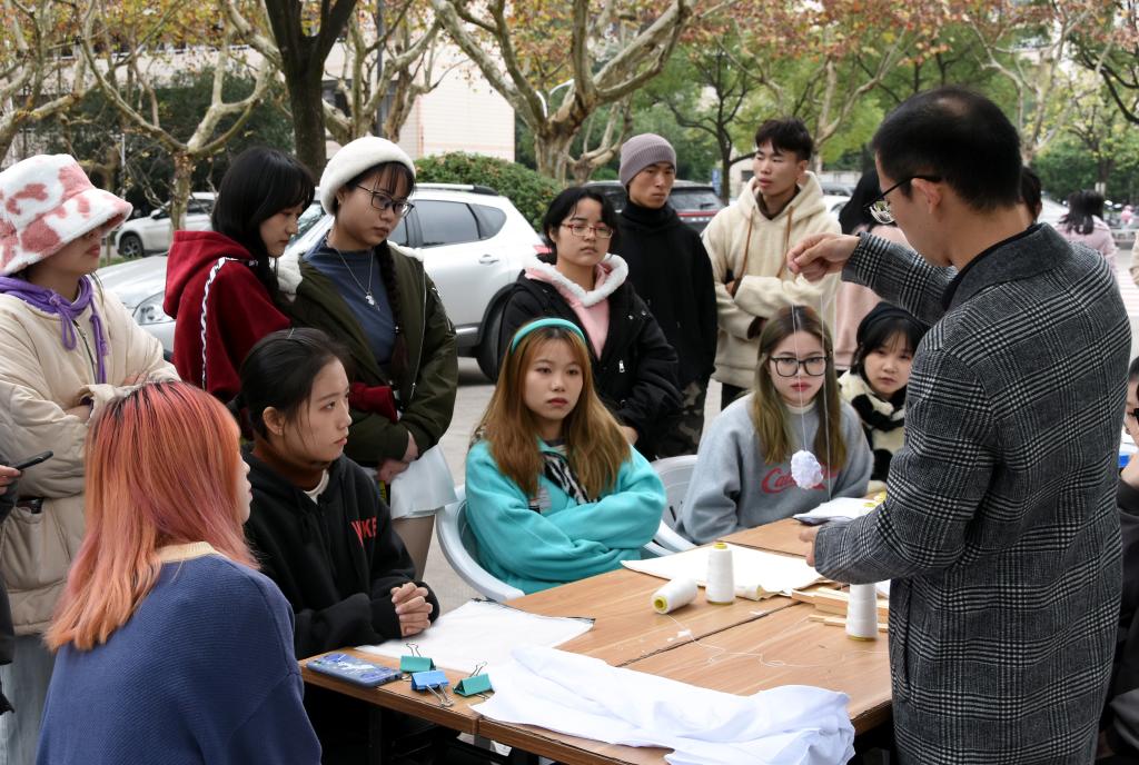 “非遗传承与创意设计实践体验”活动中,现场扎染DIY体验区吸引了许多师生的参与。纺织服装学院2009届校友叶科现场教学指导。叶科作为青年手作人,毕业后返乡创立松阳云缬文化创意有限公司,投身传统手工染、织、绣、绘产品的设计制作,带动当地及周边村民20余人从事染材种植、手工制作、产品包装等领域创业。2018年10月,他受孔子学院总部(国家汉办)邀请,作为乡村振兴代表,参加在德国法兰克福举行的中外文化交流活动,现场展示茶扎染。2020年10月,浙江省委主要领导在丽水松阳考察时莅临云缬坊,对染织非遗的传承工作给予充分肯定。另外,据悉,活动扎染织物为义卖品,义卖所得收入将全部捐入学院爱心公益平台“壹诺基金会”。“活动很有意义,不仅可以欣赏到优秀作品,动手体验,还可以献一份爱心,一举多得。”轻化工程181班学生李瑞鹏说。
