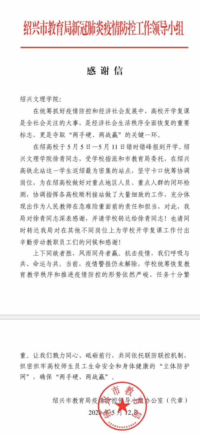 化学化工学院徐青于5月5日-11日期间,受学校指派和市教育局委托,坚守在绍兴高铁北站这一学生返绍最为密集的站点,坚守卡口统筹协调岗位,为协调指挥各高校顺利接站做了大量的细致工作,学校因此收到了市教育局的感谢信。