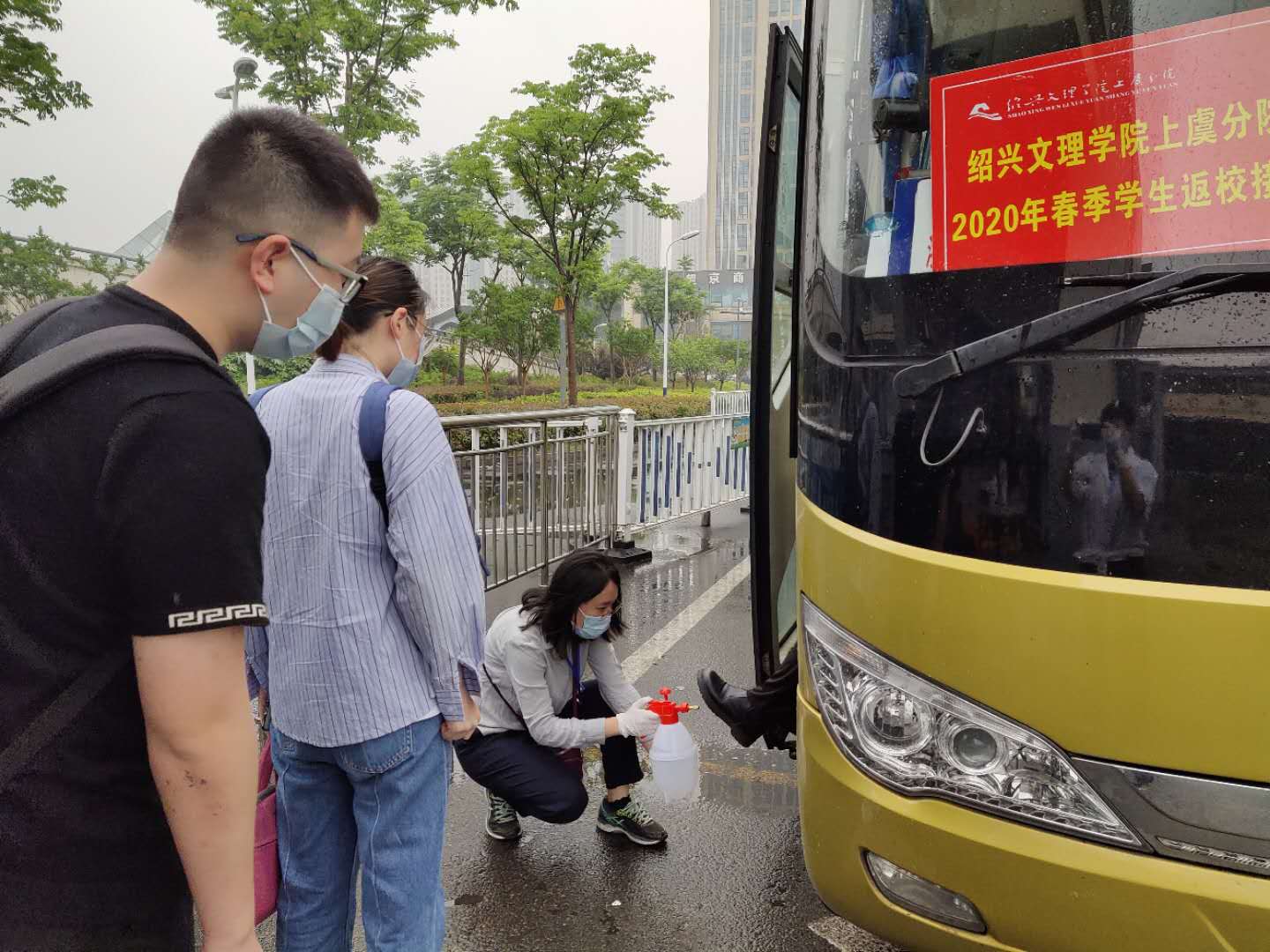 “同学你好,是我们文理学院的学生吗?请来这里。”“同学,请先保管好随身物品和重要证件。”“请大家排队扫码上车,注意保持距离,行李我们会帮你们搬上去的。”每天,来自各二级学院和机关党委的教职工志愿者戴上口罩,穿着红马甲,24小时轮流值岗,服务在萧山国际机场、绍兴高铁北站、绍兴火车站、客运中心、汽车西站、上虞东站等公共交通站点。
