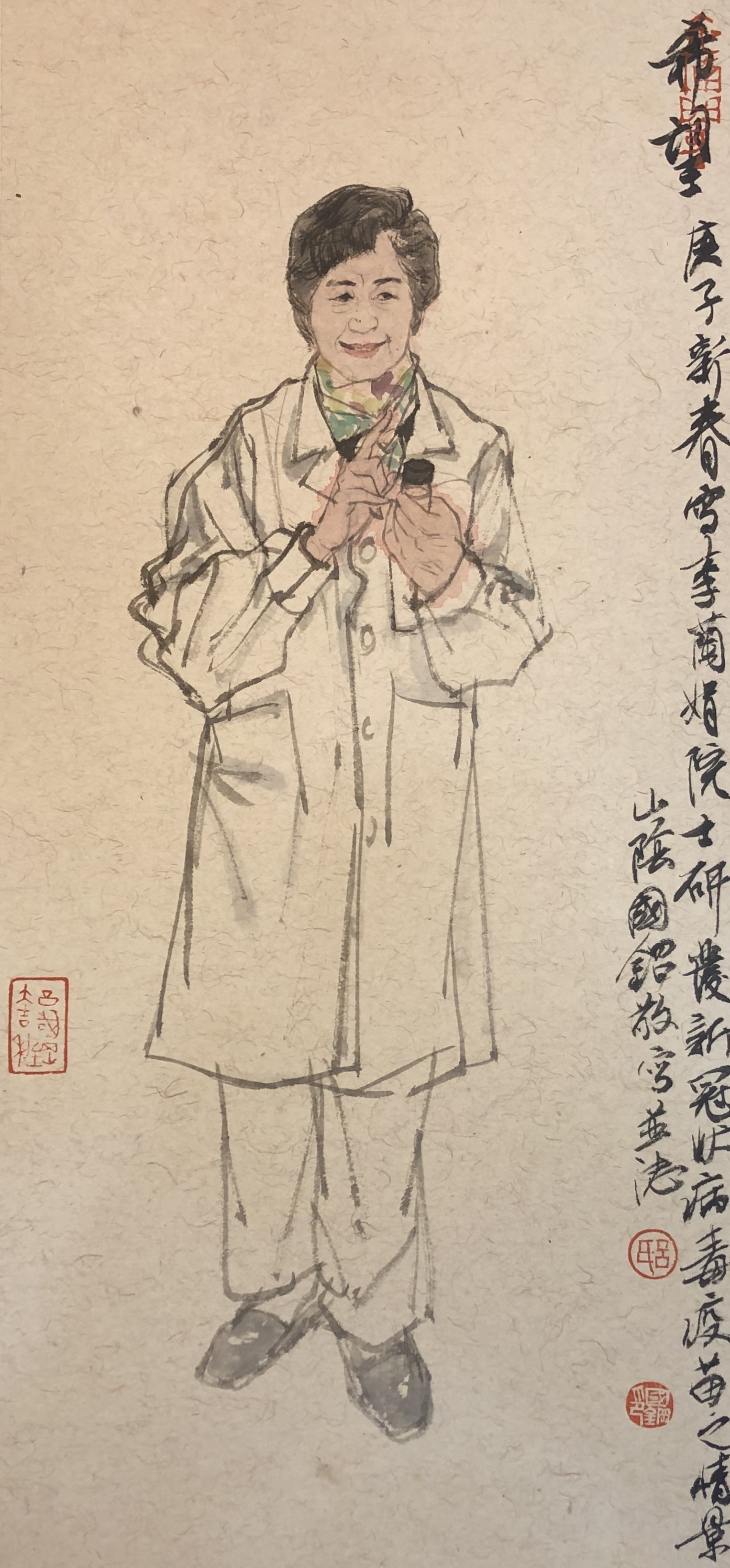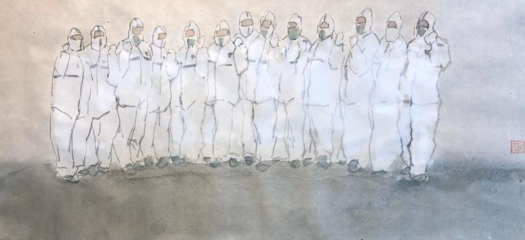 他的这些画如速写,言简意赅,短小精悍。如“逆行者”,表达一个背影,当他(她)直面危难时,给我们的那种力量,如坚山盤石,这是英雄的象征!钟南山院士令人感动敬仰,八十五岁的高龄还一直坚守在一线战场,是人民健康的真正卫士。在吕国钢心目中是民族的英雄,他小时候经常喜欢画民族英雄岳飞,然后把钟院士也画成岳飞的样子,铁甲盾牌,一只手警告人们不要食用野生动物,一手持盾,保护人民生命健康安全!