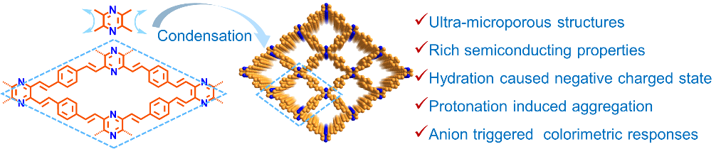 日前,数理信息学院学院竺琳博士在开展博士后工作期间利用2,3,5,6-四甲基吡嗪为关键单体,在苯甲酸酐为催化剂的条件下与含二醛基的单体形成缩合反应,成功制备了一组含有碳碳双键连接的二维共价有机框架材料(COFs),两种COFs通过质子化/去质子化表现出可调节的聚集行为,并对不同pKa的阴离子表现出孔径依赖的比色响应。这项工作不仅为微孔COFs的合成提供了新的策略,而且为探索基于比色响应的阴离子特异性检测在生物、工业和环境过程中的应用做出了贡献。