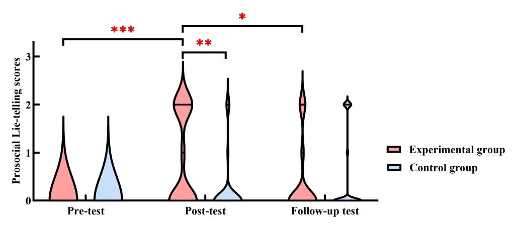 图2 实验组和对照组的亲社会说谎前测、后测和后续测试得分
