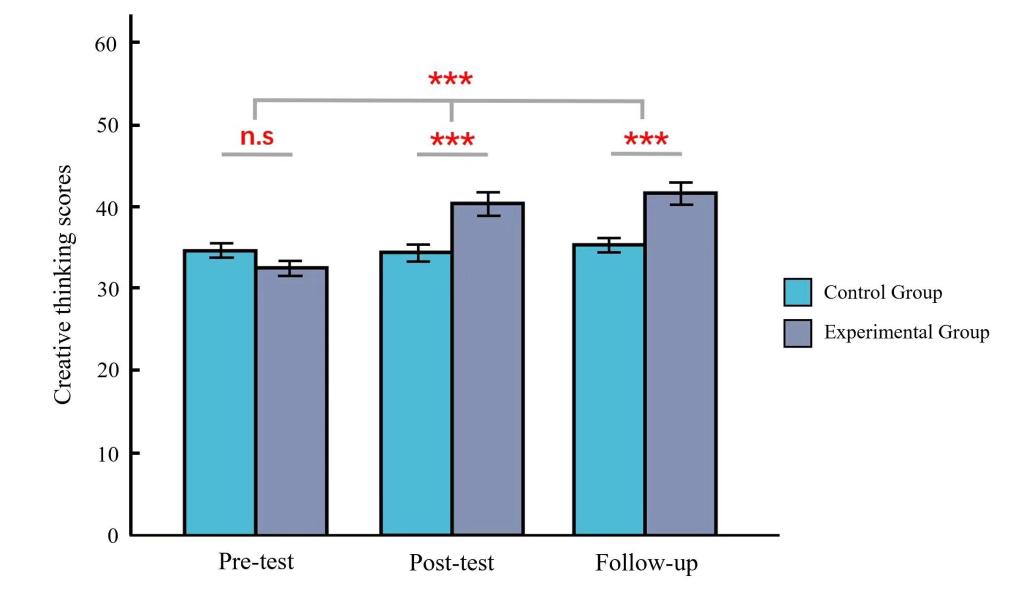 为了填补这一空白,高奇扬课题组为学龄儿童开发并评估了一个基于认知的创造力训练计划,在Thinking Skills and Creativity(SSCI,IF=3.652,中科院2区)期刊上发表了题为“Unleashing creative potential: evalsuating the impact of a cognitive-based creativity training program in the classroom”的研究论文。该研究采用了准实验设计,比较了实验组和对照组在训练前后以及后续测试中的创造性思维表现,证明了基于认知的创造力训练课程对创造性思维技能有积极、持久的影响,尤其是对创造性思维技能水平较低的学生。这对学校学生创造力的培养具有重要意义,也为教师、研究者和学校促进学校课程和教学实践的创新提供了新的见解。