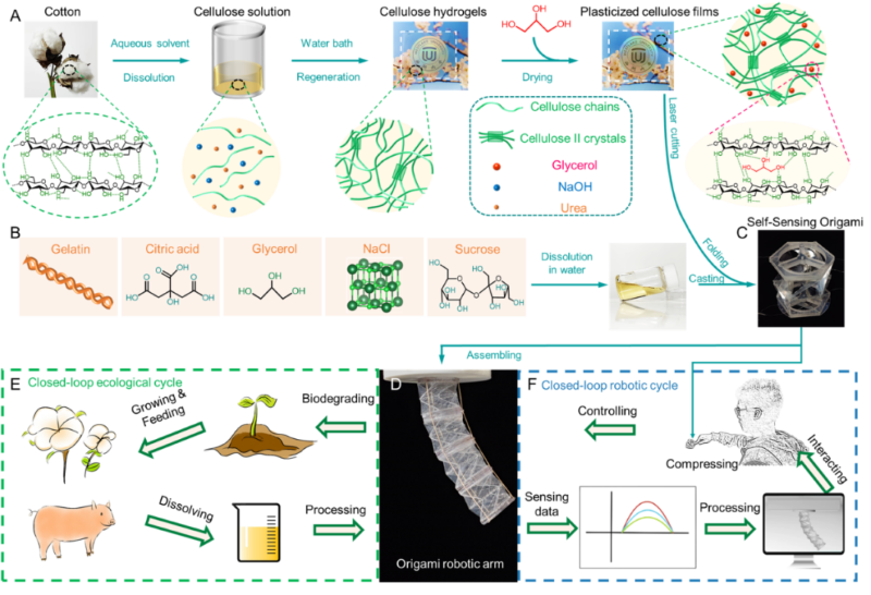 为了解决上述难题,该研究将可生物降解纤维素薄膜与可变形折纸技术结合,辅以同样可生物降解的明胶离子凝胶,提出了一种构筑可持续和可生物降解的模块化自感知折纸机器人的新方法。这种方法可以为高塑性材料和软体机器人应用场景之间架起一座桥梁,有望进一步推动高强度塑性材料在软体机器人领域的应用。如图1所示,可持续折纸机器人模块由甘油增塑的纤维素薄膜、3D打印固定板以及明胶基离子凝胶传感器组成。纤维素折纸与明胶基凝胶分别利用水系溶剂体系进行制备,两者的合成过程均不使用任何环境不友好的有机溶剂,构筑机器人系统过程的可持续性显著提升。利用该方法构筑的可持续性软体机器人系统同时实现生态循环(生长-加工-降解)和机器人功能(驱动-传感-交互)闭环。